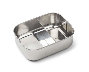 Eine leichte Brotdose aus Edelstahl mit einem süßen Silikondeckel, die in drei praktische Fächer unterteilt ist.