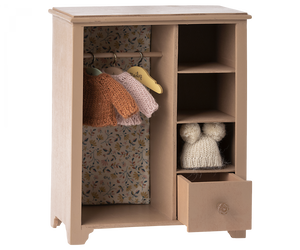 Dieser Kleiderschrank sorgt dafür, dass Deine Maileg Freunde einen Platz haben, an dem sie ihre Kleidung unterbringen können. Die Rückwand im Inneren ist mit einem schönen Stoff bedeckt. Es sind 3 kleine Kleiderbügel im Lieferumfang enthalten.