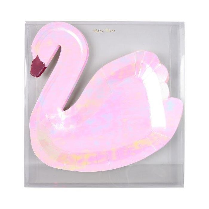 Ein perlmutt glänzender Partyteller in Form eines Schwanes mit einem pinken Schnabel. 8 Stück sind in diesem Paket enthalten und jeder einzelne hat eine Größe von ca. 24 cm x 23 cm.